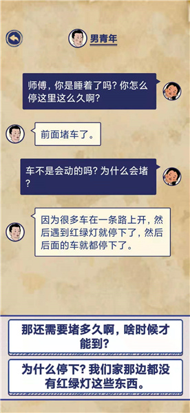 男青年:因为很多车在一条路上开,然后遇到红绿灯就停下了,然后后面的车就都停下了。