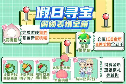 加入你的假日大冒险吧!活动期间,三条冒险之路为您开启,完成任务,即可获得对应奖励和冒险宝箱解锁几率——这可是一份神奇的超级宝箱哦!开启宝箱后会获得限定奖励,包含:全新表情·666、金钥匙x30、水蜜桃x5!