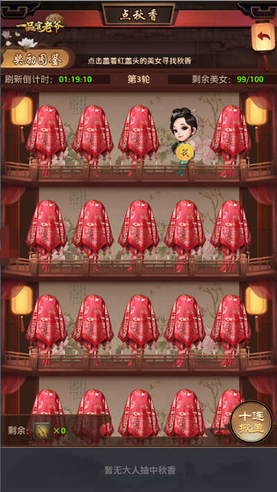 同一个美女有且只可被查看1次,每轮刷新时间为3小时,若有官人找到秋香,将立即重置所有美女开始新的一轮找秋香挑战。这次活动里除了有娇俏的新娘子,还有一些前来阻挠的小娘子,而这些小娘子的姿色可是良莠不齐,能不能顺利选中秋香姐姐,就看官人的手气啦~~