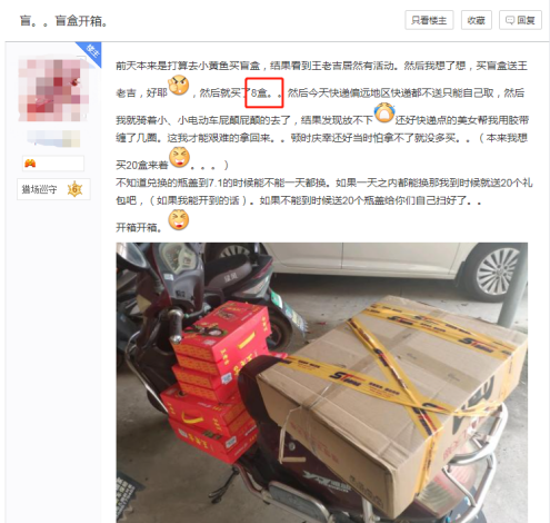 不瞒你们说,早先我在小程序上看到的时候忘记下单,等我回过神来的时候,多个平台上的盲盒版已经被热情的玩家们抢的差不多了,要不是我手速快,还在京东上抢到两箱,不然现在只有干瞪眼的份。你们看看这些疯狂的人类,究竟对这个盲盒版有多么执着,为了多搬几箱连摩托车都用上了……