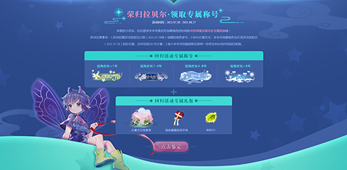 荣归拉贝尔,专属称号赠送。在《小花仙》和《小花仙》手游的专题活动网站中均上线了账号鉴定活动,无论是页游还是手游的玩家都可以参与!其中页游的账号鉴定活动是通过玩家账号注册时长来划分档次,而手游则是分为活跃用户和回归用户来派发奖励,无论你是新老玩家还是活跃或者回归玩家,都可以领取到豪华奖励和专属称号一份!