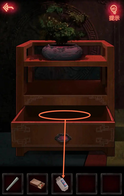 3、来到门口先拿走左边柜子抽屉里的[浆糊],然后再将蜡烛放在最右边的灯笼里,接着用火柴点亮所有未亮起的灯笼。