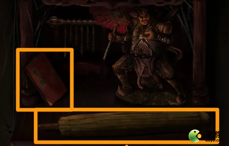点击油伞获得油伞,点击左侧红色的书获得信息,可知在傀儡头上书写红色“封”可将其驱逐。