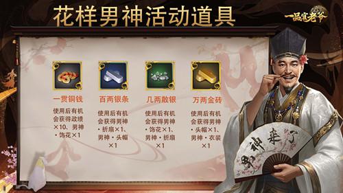 瞻彼文君子,把盏共今生。本服活动道具铜钱、散银、银条、金条道具的使用,获得数量不等政绩奖励的同时,还有机会获得男神饰花、折扇、头帽以及衣装~