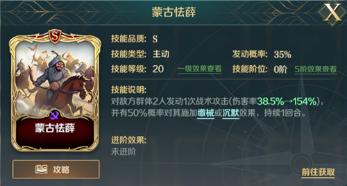【蒙古怯薛】是一个群体控制技能,能对敌方2人造成不俗的伤害,且能较大概率的为对方施加缴械或沉默,还附带一定的伤害能力,是一个泛用性较强的技能。