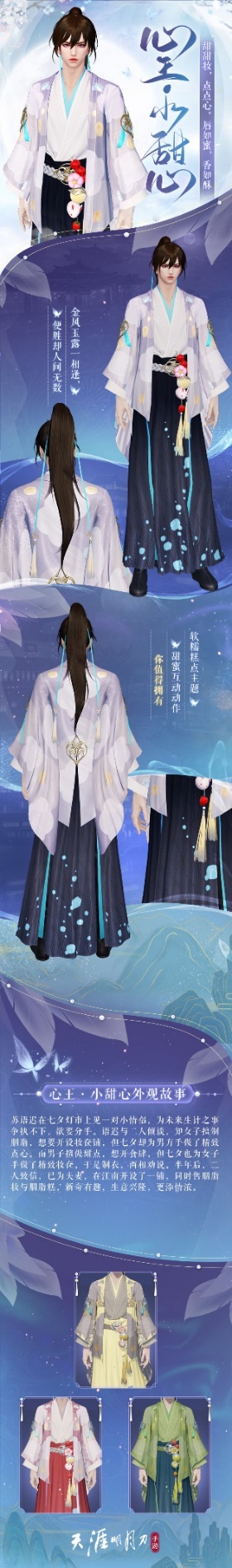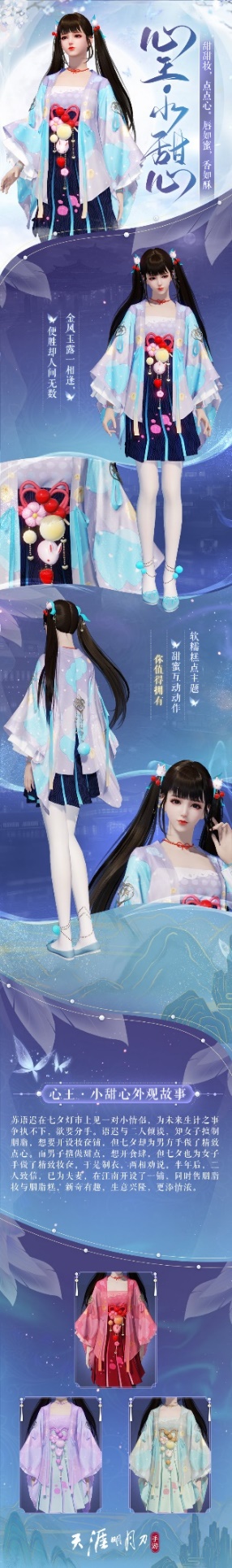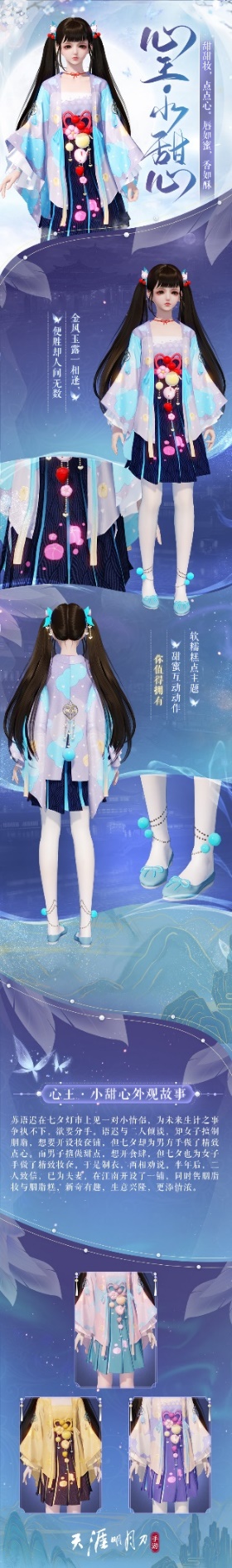 甜甜妆,点点心。唇如蜜,香如酥。七夕外观【心王·小甜心】以糕点为主题,元气撞色设计、可爱唐菓子点缀,附赠超可爱配套双人交互动作【心甜】,先来跟刀妹提前看看这波外观有多甜(。・∀・)ノ゙