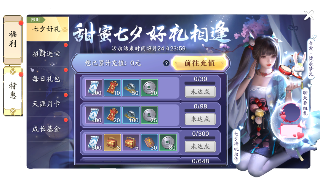 活动上线时起至8月24日24时,少侠即可在活动界面免费领取七夕礼包,活动期间,少侠累计充值达指定金额,更可获得丰厚大礼哟。活动中不光有高额绑点回馈,更有永久头饰-吾爱·拨浪梦兔、灵憩·小妆台、头像框-臻情之心、对话框-臻情之心、天涯令·五、传说神兵自选礼、琅纹残片自选礼、神品心法自选礼等稀缺豪礼,快来“福利-特惠-七夕好礼”看看吧。