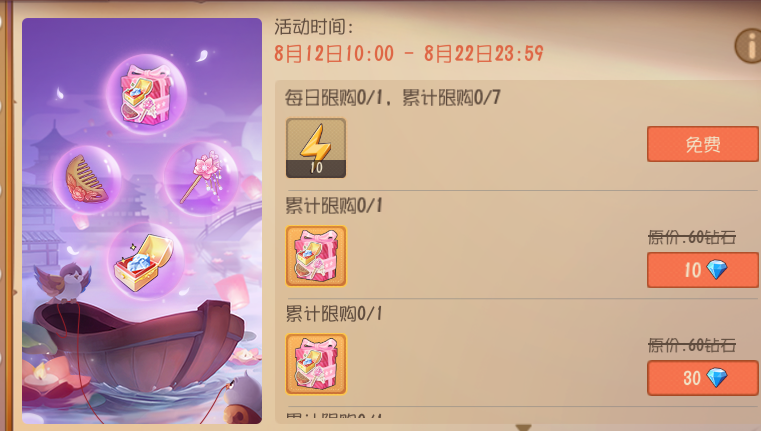 8月12日至8月22日期间,七夕亲密礼物礼盒商城限时开业。除了每日免费活跃度可供领取,还有限量的骨折特惠任君挑选!七夕亲密礼物礼盒开启后,可随机获得钻石奶酪*1,桃花琉璃簪*1,梅花檀木梳*1,亲密红玫瑰*1,亲密情书*1其中之一。