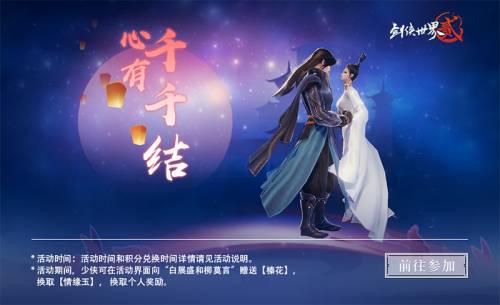 一年一度的大型七夕活动,心有千千结活动返场。临安城内的白展盛和柳莫言闹了别扭,需要少侠为有缘人赠送饱含情意的游戏道具【榛花】,帮他们解开心结。少侠每次赠送【榛花】都会增加白展盛和柳莫言的心结解锁进度值,赠送后会获得【意重情谊回馈礼盒】奖励。