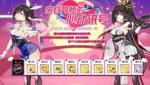 粉红色鹊桥频繁地发出心动讯号,是你带领我找到接收它的频道~有你的陪伴,这个七夕的主旋律只可能是浪漫!8月12日更新维护后 – 8月25日23:59动期间,玩家累计登录10日即可领取推荐信、SSR战姬自选箱、2021七夕节头像框等奖励。此外,活动期间登录游戏还可在邮件内领取「七夕誓约之礼」!