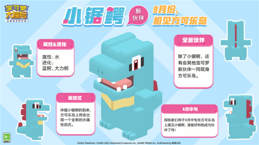 即将来到方可乐岛,小锯鳄也将为探险家们带来许多惊喜——它将有一个全新的水属性招式与它同步登场,随着等级的提升,小锯鳄还可先后进化为蓝鳄和大力鳄,为探险家的战斗带来更多精彩!在9月中旬即将上线的重磅更新中,小锯鳄将带领其他宝可梦一起现身,而且还将有全新岛屿地图和全新料理食谱与探险家们见面,敬请期待!