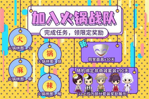 活动期间,将任意讨好、整蛊道具换成“食材”,每花费388食材即可制作一份讨好道具:麻辣火锅!被使用后全房间内的玩家可平摊1200游戏积分。