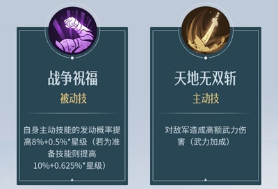 自身主动技能的启动概率提升8%+0.5%*星级(若为准备技能则提升10%+0.6259%*星级)