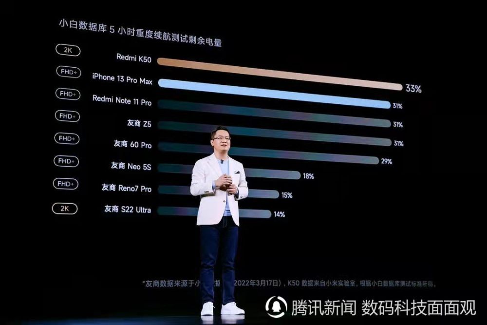 值得一提的是,Redmi K50系列在续航方面同样迎来突破。Redmi K50内置5500mAh巨无霸电池,配合67W快充技术,续航测试竟然超越了iPhone13 Pro Max,续航时间长达1.3天。Redmi K50 Pro首次将超百瓦秒充技术与大容量电池整合,内置5000mAh大容量电池,配合120W秒充技术,充满电仅需19分钟,从此告别低电忧虑。