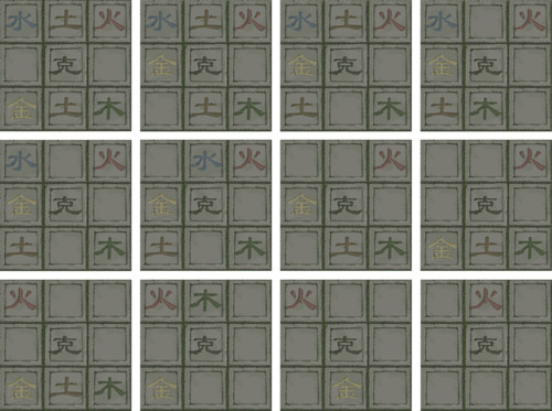 龙隐峡(5,4):五行砖,【启动机关】(五行阵小游戏,「火」克「金」、「金」克「木」、「木」克「土」、「土」克「水」、「水」克「火」,最后留下火即可通关)
