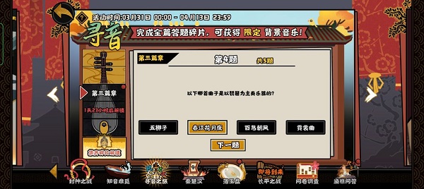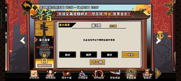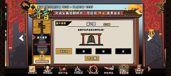无悔华夏寻音之旅第三篇在今日伤心啊了,给玩家带来了5个答题,玩家可以通过完成答题来得到奖励。接下来小编给玩家们带来了寻音之旅第三篇答案一览,感兴趣的小伙伴一起来了解一下吧。