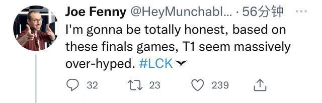 而在这场比赛还在进行中的时候,场外发生了一件很有意思的事情。当时比赛的第三局游戏刚刚结束,LPL的英文流解说在社交媒体上发表了自己对这三场比赛的看法,他说“看完这三场比赛后,我觉得T1被高估了”。
