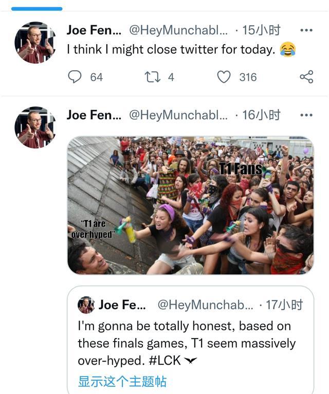 而在T1和GEN的比赛结束后,这位LPL英文流解说也是因为这件事遭到了全球T1粉丝的“围攻”,他自己还发了一张图形容现在的情况,一大堆人围着他嘲讽,还表示自己今年可能要关闭社交账号了。要知道T1可是全球人气最高的LOL职业战队,粉丝不计其数,JOE会被喷麻也是很正常的事。