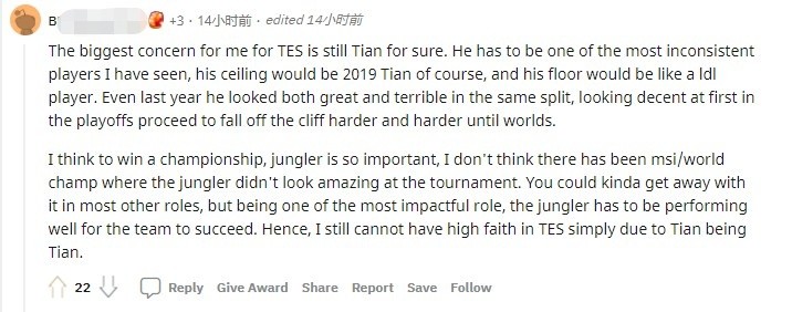我觉得想要赢得冠军,打野是非常重要的,我觉得获得MSI/世界赛冠军的队伍中,没有在那次赛事中表现不出色的打野。其他位置也许可以稍微混一混,但是打野作为游戏中最具影响力的位置之一,队伍想要成功,打野必须要打的好。所以,因为Tian就是Tian,所以我对TES的期待没那么高。