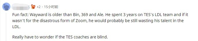 -有趣的是,Wayward比Bin、369、Ale还要老道。他在TES的LDL团队待了3年,如果不是应为Zoom的状态下滑,他可能还在LDL联赛中浪费自己的才华。真的要怀疑TES的教练是不是瞎。