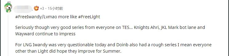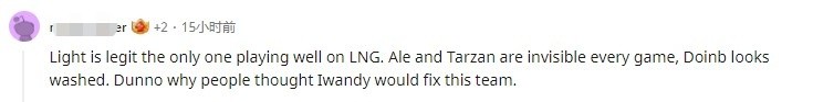 Light是唯一一个在LNG中表现良好的选手。Ale和Tarzan每场比赛都隐身,而Doinb看起来都在划水混日子。不知道为什么人们认为Iwandy会修复好这支队伍。