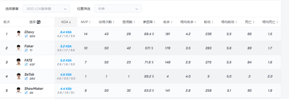 在LCK中单数据排行中chovy以6.4的KDA排在第一位