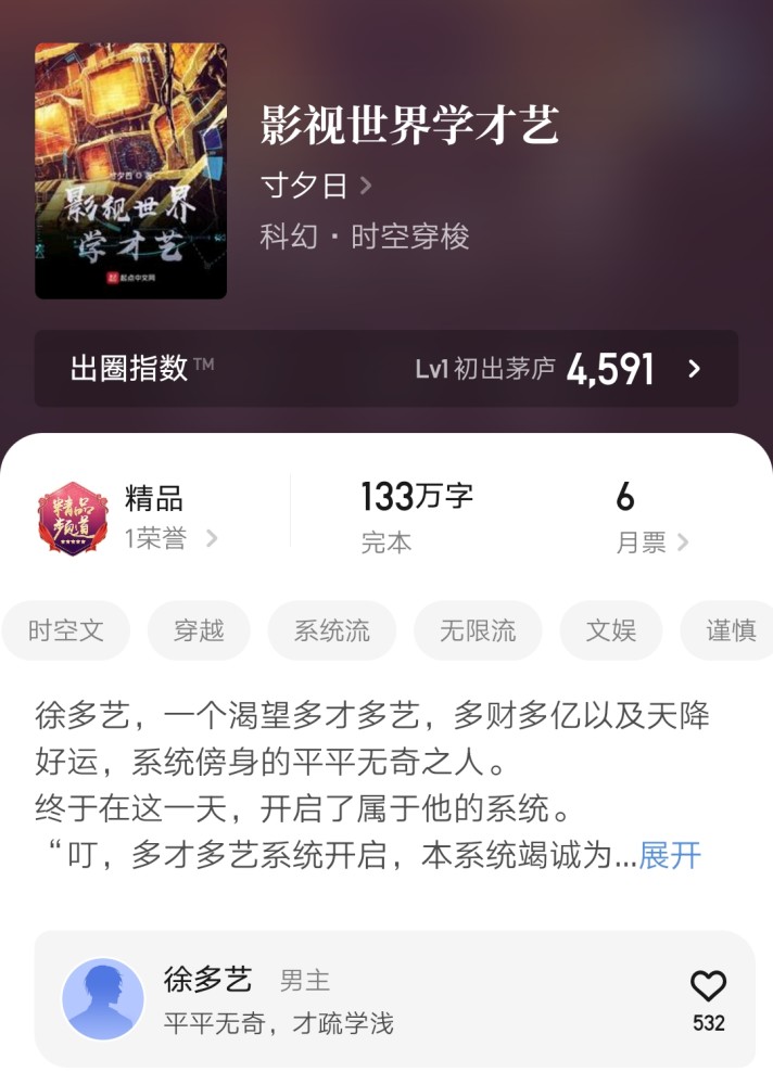 寸夕日的作品,影视同人类的无限流小说。小说第一个越狱副本和第二个以“人间正道是沧桑”为模板的谍战副本写得最有意思,读者评价也最高,至于其余的副本表现就比较平平了。