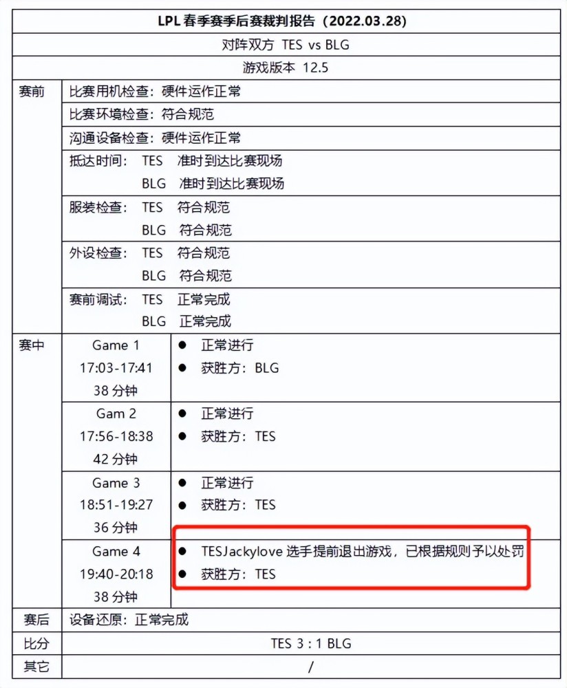 事情是这样的,近日LPL裁判给出的比赛报告中,在TES和BLG的比赛中,TES下路选手阿水,因为提前退出游戏,根据比赛规则,已经给予了阿水相应的处罚。