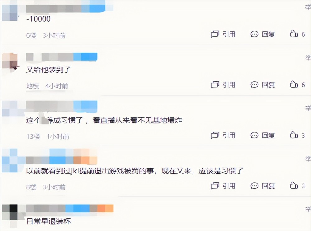 对于阿水在季后赛连续被处罚两次的事情,玩家们看到后都表示阿水这波属实是已经有点“养成习惯了”。在平时阿水直播Rank排位中,基地爆炸的那一刻阿水就喜欢按快捷键提前退出游戏。使得在LPL比赛过程中,基地爆炸的那一刻阿水也下意识的按了两下快捷键,然后提前退出了游戏。这样被处罚的事情,阿水已经不是第一次经历了。