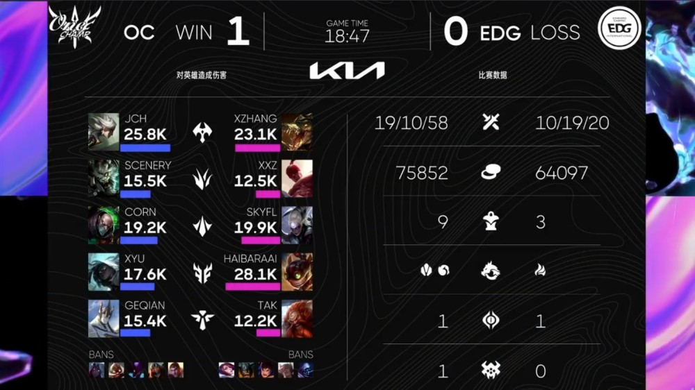 双方第一局的比赛,前中期打得比较焦灼,击杀数和经济呈犬牙交错之势:OC拿到一血后,前6分钟内,双方“和平发育”,OC拿小龙,EDG就拿峡谷先锋;转折点发生在9分钟的峡谷先锋处,OC主动开团,拿下峡谷先锋后,开始逐渐掌握峡谷的节奏;13分钟左右,OC主动开团,击杀EDG两人后,轻松斩获大龙,随后携大龙Buff推进,一波拿到EDG两座高地塔;18分47秒,OC集火EDG两人后,带着兵线,一波推平EDG主堡水晶,拿下第一局比赛的胜利。