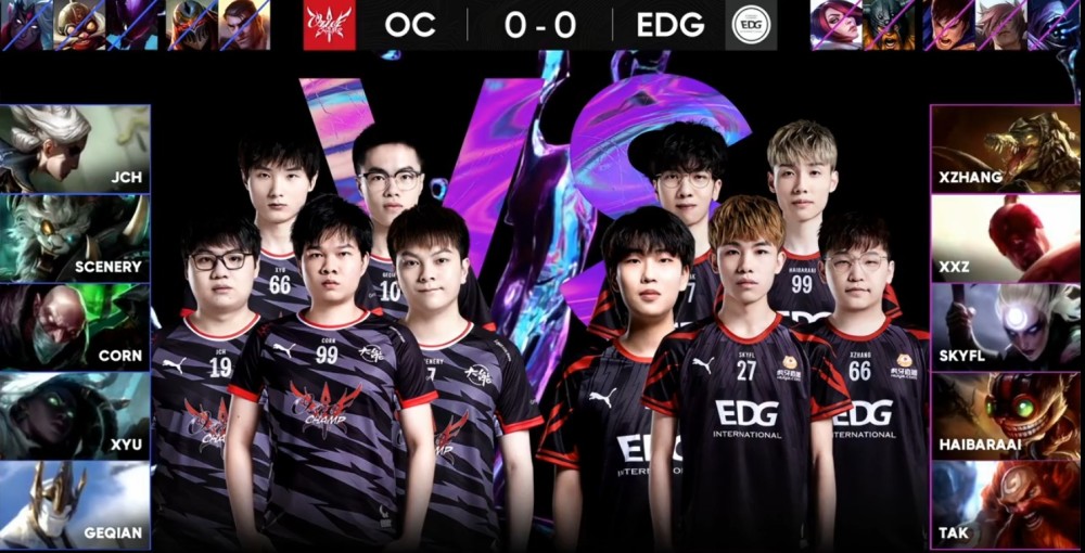 第一局比赛,OC蓝色方,禁用韦鲁斯,库奇,螳螂,劫,杰斯,选用赛娜,青钢影,加里奥,狮子狗,炼金;EDG红色方,禁用武器,瑟缇,盖伦,奥拉夫,剑姬,选用鳄鱼,盲僧 ,皎月,炸弹人和酒桶。