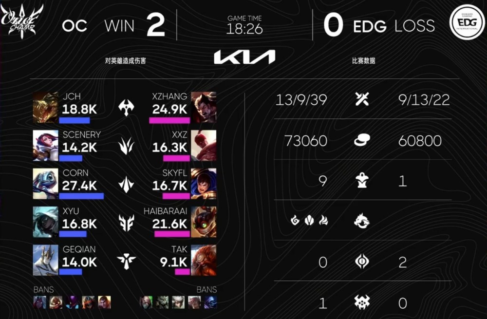坦率地说,双方第二局简直就像是第一局的复刻版,都是前中期双方“和平发育”,拼中后期。转折点依旧发生在9分钟左右,EDG先动小龙,OC成功接盘,并将小龙拿下;13分钟左右,OC再一次接盘EDG小龙,随后击杀三人后,轻松Rush大龙;18分做鱼,EDG再次率先动远古巨龙,但又一次被OC接团,在随后的拉扯中赢下团战,并一波击溃EDG。