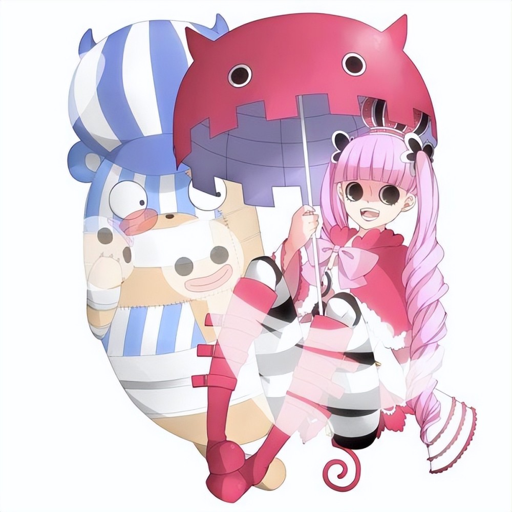 佩罗娜一直留着粉色的双马尾,大概是吃了幽灵果实的原因,长着两只黑色的大眼睛。三诡帆船之后就一直跟着鹰眼,后来两年后护送索隆到香波地岛。长大后的佩罗娜亭亭玉立,喜欢撑着酒红色的雨伞穿着哥特风的衣服。