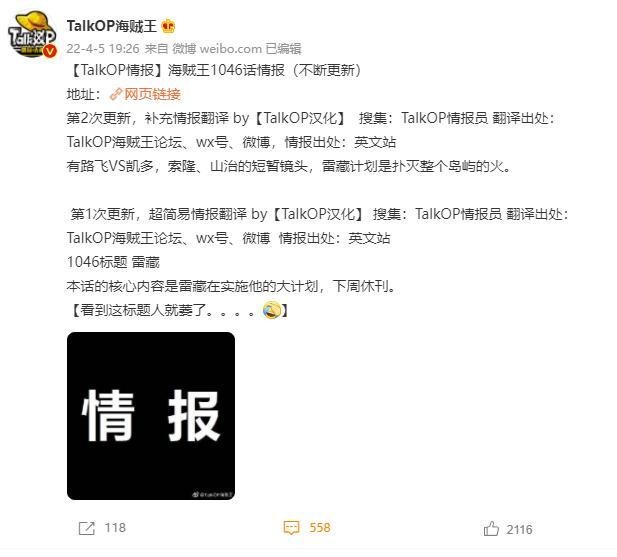 在经过一个星期的漫长等待后,《海贼王》漫画最新的1046话情报终于来了(情报来源于talkop论坛)。只不过这一话的主要内容并不是我们期待的“太阳神”路飞和凯多的决战,路飞和凯多的画面只有一点点,最主要的还是赤鞘九侠成员雷藏的内容。
