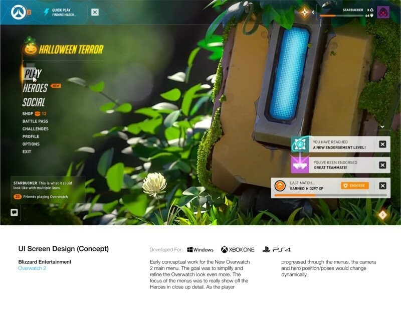暴雪高级UI设计师Jayson Kirby泄露了《守望先锋2》的主菜单界面,暗示游戏或将有战斗通行证系统。