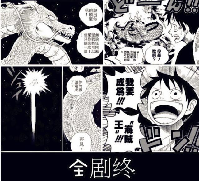 我们都知道尾田老师最崇拜的人便是鸟山明大师,他的《海贼王》漫画好多地方无不借鉴了《龙珠》这部作品,最明显地就是,主角路飞就是根据漫画《龙珠》构思出来的。所以,有网友就脑洞了一下,海贼王X龙珠版的结局,最后路飞通过蛟龙果实的桃之助召唤出了神龙,并且路飞许下“我要成为海贼王”的愿望,神龙实现了他的愿望,完结。真当我们没看过漫画吗?【捂脸】