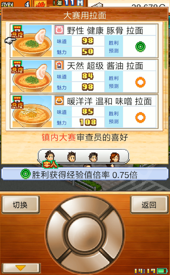 另外玩家也要兼顾经营中会出现的一些问题,例如员工的能力与薪资,招牌拉面套餐是否受欢迎,当下流行食材情况等等等等,在第一次扩建拉面店后,经营就不再是一帆风顺的,具备了一定挑战性的经营使玩家不得不去思考拉面店的出路,这给予了游戏一些创造空间与重玩价值。