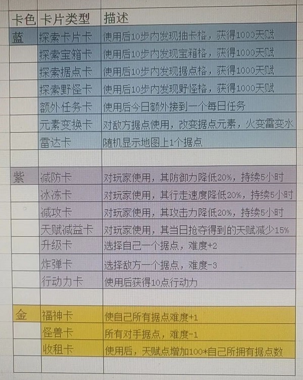 卡片当前版本所有种类如下图