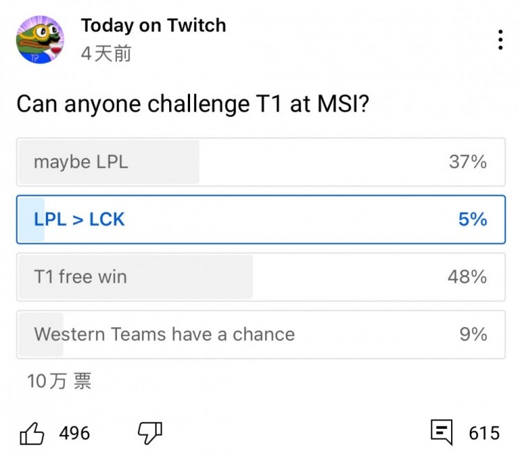 虽然现在还不确定LPL是否能参赛,但国外网友最近发起了一个投票,题目叫「有人能在MSI上战胜T1吗」,在参与的10万人投票中,有接近一半的网友认为T1会轻松取胜,当然也有37%的网友认为LPL会取胜,还有9%的网友认为,西方队伍也有机会!