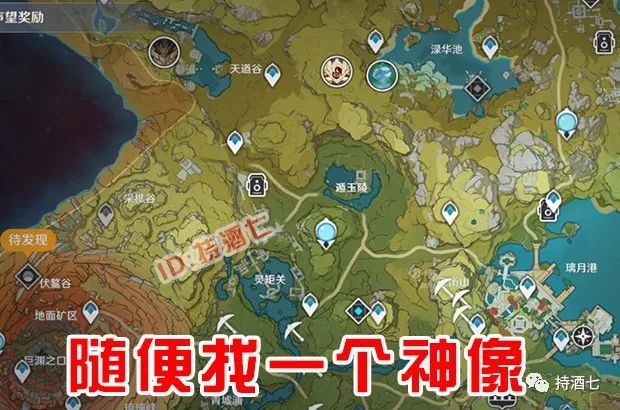 首先,我们随便传送到一个七天神仙脚下。(我们第一次接触的是星落湖的七天神像)。这里我传送到的是璃月的岩王爷神像下方。