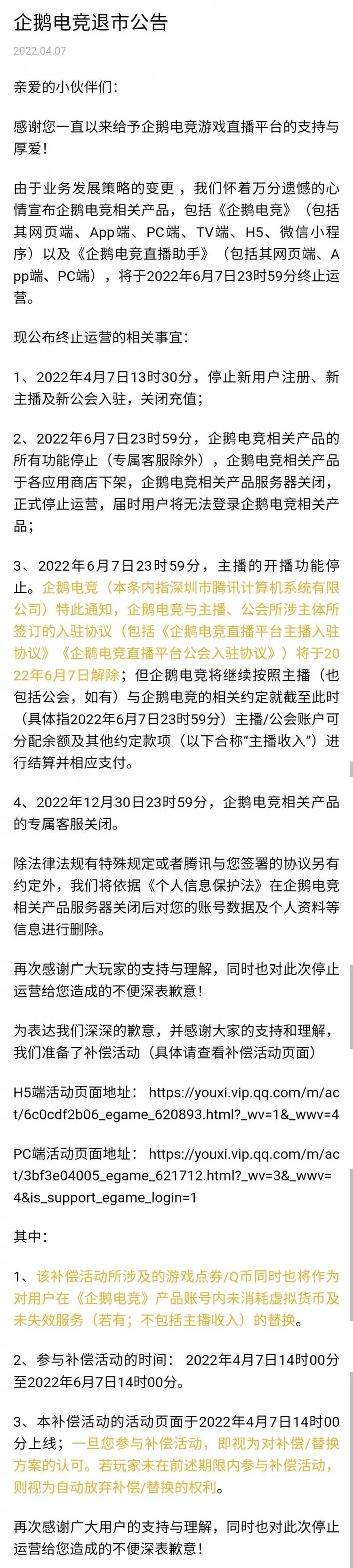 今日企鹅电竞发布公告:由于业务发展策略的变更,我们怀着万分遗憾的心情宣布企鹅电竞相关产品,包括《企鹅电竞》(包括其网页端、App端、PC端、TV端、H5、微信小程序)以及《企鹅电竞直播助手》(包括其网页端、App端、PC端),将于2022年6月7日23时59分终止运营。