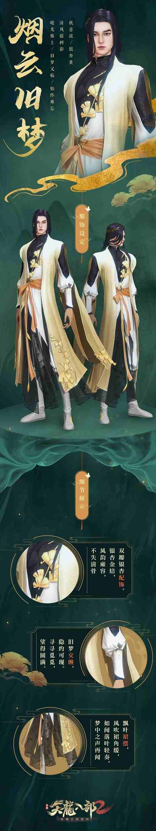 女版的烟云旧梦时装更是精致,除了主元素银杏叶外,那一层烟云笼纱带来了几分朦胧。一切宛如梦境,梦中秋意浓,银杏叶随风飘落的景象甚是美丽,清醒之后此般意境仍令人难以忘怀!相信少侠们在游戏中穿上这款“烟云旧梦”之后无论走到哪里,都会为身边人带来浓厚的秋意!极致的服装材质表现搭配上时装所带来的极美意境,少侠们是否已经心动了呢?
