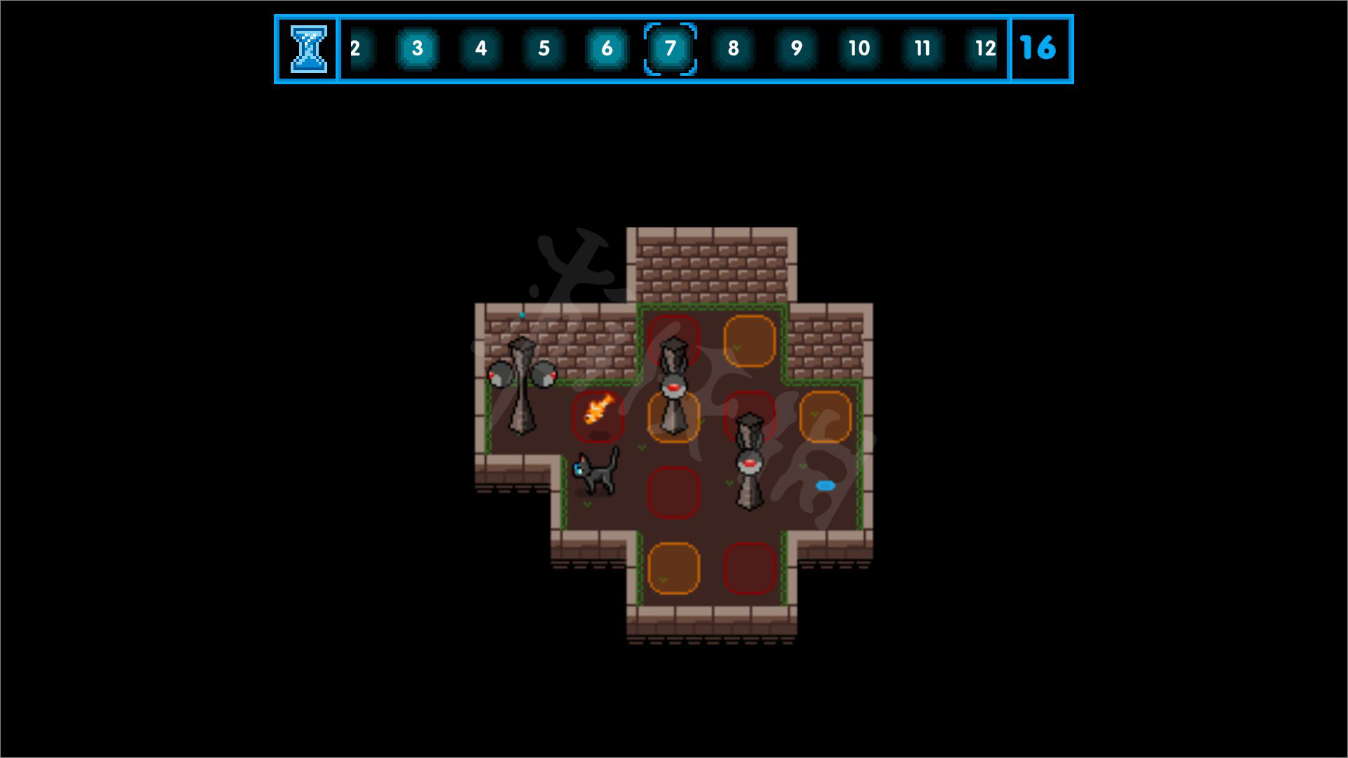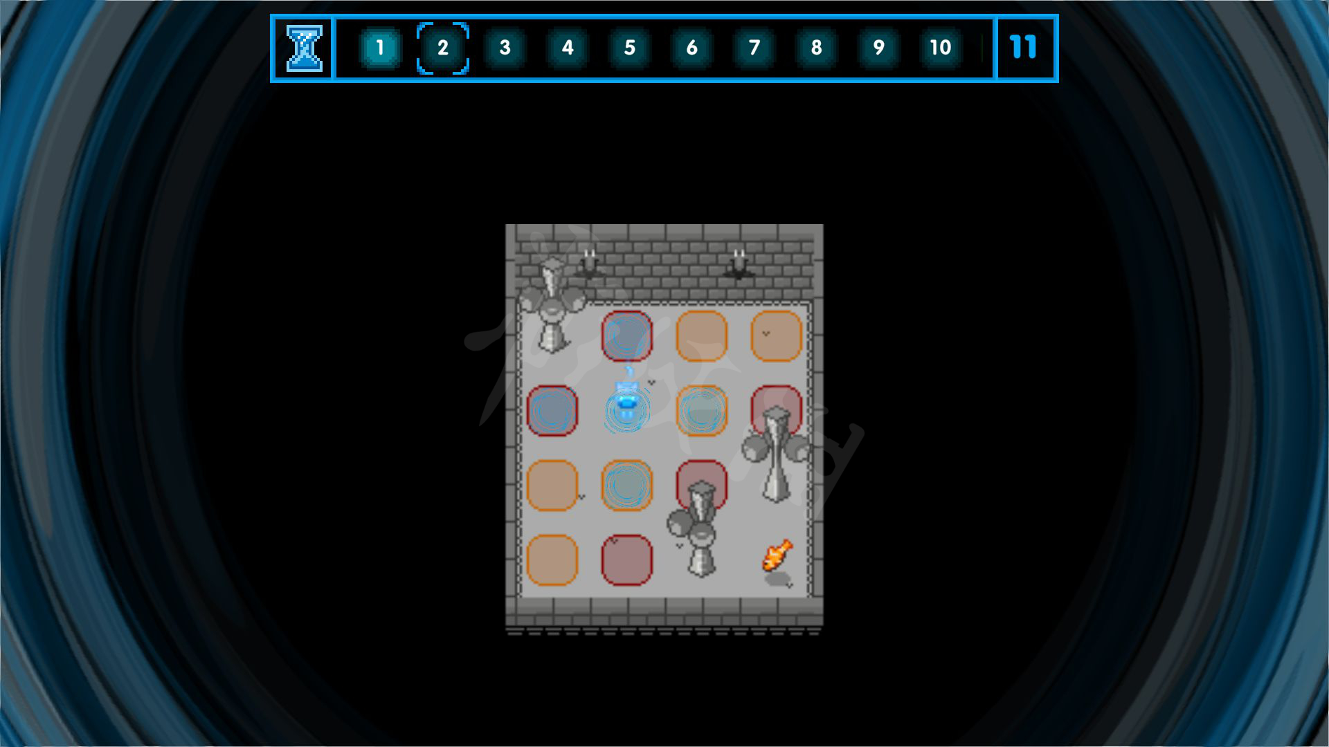 游戏的玩法叙述起来很简单,就是想办法规划一条合理的,从起点到终点的路线,并规避不断向你靠近的敌人,这个玩法很复古,早在许多年前就已有相似的游戏设计,例如POPCAP公司的益智小游戏《木乃伊》。但《时间之神的猫》一改传统的正方形场地设计,将大部分可通行路线做成了只可一人通行的单行道,通常来说,在关卡中被敌人堵到死角是不可避免的,游戏的过关思路也并非将蠢笨的敌人卡在一个坑位中动弹不得,而是利用时间跳跃的能力,如一只轻盈灵活的猫一般,穿梭时空,戏弄敌人于股掌之间。