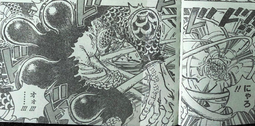凯多对着路飞释放一记“军茶利·龙盛军”,路飞在五档的作用下仿佛是变成一个玩具,就算被打击也变成“锤子”的样子,虽然有些心疼,但实在是有够搞笑。当然,既然是互轰,那么路飞也对着凯多一顿乱轰。路飞的乱拳也命中了凯多的身体,从图片上来看,凯多的身体像是“气球”一样鼓了起来。