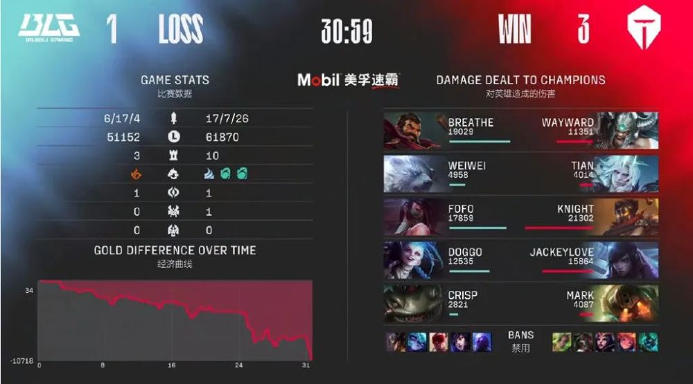 第一局,蓝色方TES一抢打野狗熊,但选出了需要大量发育时间的传统法师维克托,下路金克丝+璐璐的推线组合,是TES在近期的首次尝试;反观BLG在counter pick位选出了上单男枪,Crisp拿出了招牌烈娜塔,配合FoFo佐伊,整体阵容成长曲线更加合理。前期节奏争夺战中BLG凭借阵容优势轻松占优,TES几次找机会未果,中期BLG果断rush大龙锁定胜局。