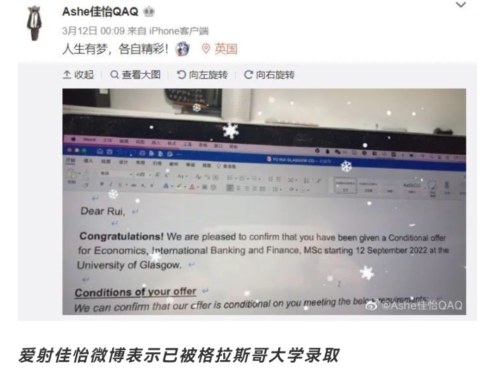 18年决定重返校园,进入到双一流的川大读书,结果第一年就以优异的成绩,通过了雅思;就在今年3月份,他又发微博说,已经被英国格拉斯哥大学录取,将会前去攻读金融学,与此同时,他还在等待哥伦比亚大学和爱丁堡大学的通知书。