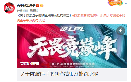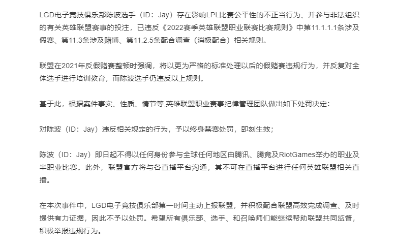 官方表示已经确定LGD选手陈波存在影响LPL比赛公平性的不正当行为,便非法参与了相关投注。针对于这名选手官方做出以下惩罚,给予终身禁赛惩罚,即刻生效。即日起,不得以任何身份参加全球地区任何由腾讯,腾竞举办的比赛。此外英雄联盟官方将会与各个直播平台进行沟通,不可让他在直播平台中出现有关英雄联盟。