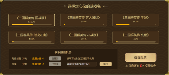 《三国群英传M》国服更名投票活动历时7天落下帷幕,本次投票活动秉承公平、公正、公开的原则,实时显示得票率。最终得票最高的中文游戏名称为《三国群英传 国战版》,占比53.02%,其次为《三国群英传 手游》占34.1%%,感谢各位参与投票的玩家。根据投票结果,《三国群英传M》国服正式更名为《三国群英传 国战版》。