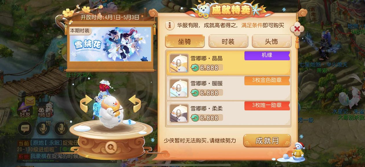 为回馈每一位积极参与成就月活动的玩家,《梦幻西游》手游特地在成就特卖商城中准备了精美的礼物。若你满足在成就榜中排名前10,成功撷取一枚金勋章,或者一枚唯一勋章等条件,就能解锁雪绒花主题坐骑、时装、头饰的购买资格,让自己成为众人艳羡的目标哦!