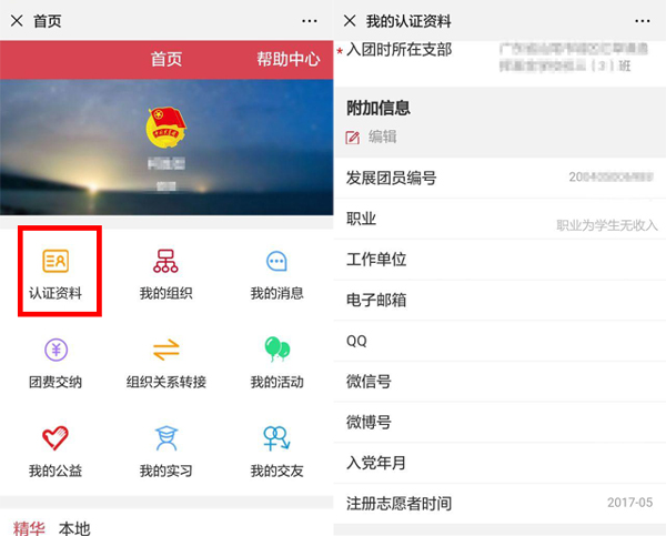 智慧团建报到时间在认证资料处就能看到自己的报到时间。查看报到时间操作如下